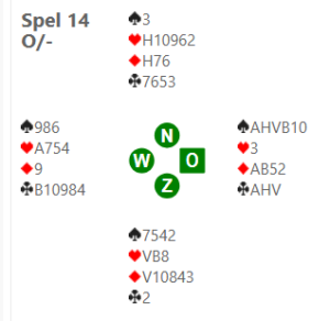 Afgelopen donderdag lukte het de helft van de tafels niet om verder dan 4♠ te komen, terwijl het een heel goed groot slem was: Als je niet weet hoe je dit spel naar slem moet bieden kan je het aan de rubriek ‘Vraag het Berry’ in het bridgeblad vragen. Op dit spel hoeft ‘Vraag het Berry’ echter niet ingeschakeld te worden, want bij ons aan tafel lieten Berry en Vincent zien hoe 7♠ geboden moet worden: – 2♣ 2♦ – 2♠ 4♦ (splinter) – 4SA 5♣ (1 aas) – 7♠ Een aas, drie troeven en een singleton was voor Berry meer dan genoeg om met 4♦ te splinteren. Dat paste mooi in Vincent zijn hand en hij had er toen geen enkele moeite mee om zeven schoppen te bieden. Hanneke kwam met troef uit, de boekjesstart tegen groot slem. Alleen met (de onvindbare) hartenstart is 7♠ down omdat dan de entree voor de klaveren is weggespeeld. Berry trakteerde ons met hun praktische biedverloop op -12 imp’s. Waarschuwing: kijk uit als Berry trakteert, zijn zak met ‘Le Croquet du Berry’ is nog lang niet leeg.