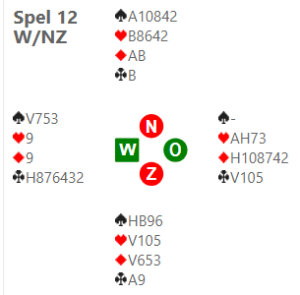 Op spel 12 kon iedereen beslissingen nemen in het bieden en af- en tegenspel. Het begint al met de opening, is de westkaart een 3♣ opening (ja) en (wat) biedt noord dan? Oost knalt na 3♣ natuurlijk meteen 5♣.