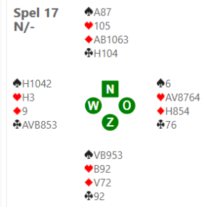 Ons nevenpaar kwam met klaver uit tegen 4. Na klaverstart is het contract bijna altijd gemaakt. Noord moet na ♣H klaver terugspelen, anders is het contract al meteen gemaakt. Oost gooit dan echter meteen ♠6 weg op een hoge klaver. Zuid mag troeven, maar daarna zitten hun troeven 2-2 en na A en H kunnen de drie vrije klavers wel worden geïncasseerd. NZ maken alleen ♣H, een introever en A.