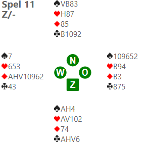Hanneke opende als zuid met een topzware 2SA en Maurice zag dat dit down zou gaan en doubleerde voor straf. Als noord realiseerde ik mij dat west dichte ruiten moest hebben maar ik twijfelde of 3KL Niemeijer of echt was. Ik paste en oost paste ook. Gelukkig kent Hanneke haar klassieken en zij kon (ook) in haar hand zien dat west een dichte ruitenkleur moest hebben. Zij redoubleerde en mijn 3S werd gedoubleerd door oost. Toen koos west eieren voor zijn geld en bood 4R, wat gedoubleerd 3 down (-500) ging. Er viel nogal wat na te praten over dit spel. Maurice baalde dat hij te begerig had gedoubleerd, zonder doublet waren we in 3SA terechtgekomen waartegen Maurice 7 ruitenslagen zou hebben opgeraapt. Hanneke en ik waren het snel eens dat na het doublet 3Kl door noord natuurlijk nog steeds Niemeijer is. Op de frequentiestaat zag ik maar liefst 7 keer 3SA-3 staan. Daar zullen de westspelers hun mond hebben gehouden waardoor zuid argeloos in 3SA terechtkwam. Aan de tafels waar zuid 2Kl opende om een 22-23 SA aan te geven zal west wel 3 of 4 ruiten hebben geboden waardoor NZ voor een plusscore allen nog maar hoefden te doubleren of 4H of 4S te bieden. De komende butlerserie doen Hanneke en ik niet mee vanwege twee donderdagen op Madeira en nog wat andere verplichtingen. Ik hoop dat iemand anders de komende zes keer een stukje over de clubavond wil schrijven.