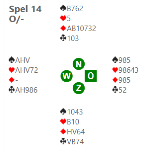 Ik had me voorgenomen om het niet te vaak over groot slems en het bieden van Berry en Vincent te hebben. Maar afgelopen donderdag was er een spel waar ik graag een uitzondering voor maak: Hanneke en ik boden zo: 2♣ – 2♦ 2♥ – 4♥ 6♣ – 6♥ Na afloop zeiden we tegen elkaar dat het onmogelijk is (voor ons) om uit te vinden of oost een derde klavercontrole heeft. Geeft oost een driekaart klaveren en groot slem is kansloos. Op de frequentiestaat zag ik dat twee paren 7♥ hadden gebonden. Dat waren Henk van Uden en Leon Hoogenboom en… Berry en Vincent. Berry en Vincent hadden 7♥ ongetwijfeld geboden op een leerzame en wetenschappelijke manier. Daarom navraag gedaan bij Vincent en hij vertelde me hoe het bieden bij hun was gegaan: Berry – Vincent 2♦ – 2♠ 7♥ – pas Vincent: ‘Berry opende 2♦ met de bedoeling om een 24-25 SA aan te geven. Nadat hij had geopend keek hij nog eens in zijn kaarten en zag dat hij niet een driekaart harten en een dubbelton ruiten had, maar een vijfkaart harten! Na 2♦ kon hij deze kaart niet meer aangeven omdat sterke ongebalanceerde handen dan altijd ruiten als langste kleur hebben. Ik bracht echter redding want mijn 2♠ belooft hartenlengte om te anticiperen op een sterke SA, zodat 4♥ in Berry’s hand zou komen. Berry kon uiteraard geen verder onderzoek doen omdat hij deze kaart niet kon hebben. Dus dan maar 7♥.’ De ongelukkigen die door Berry op -13 Imp’s werden getrakteerd waren Jacco en Aarnout. Overigens scoorden Berry en Vincent in deze Butler-competitie +265 imp’s (een record?) over zes avonden!