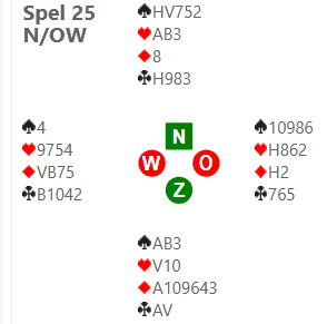 Kansberekening speelt een grote rol bij het bridgen. De meeste spelers hebben de percentages niet in hun hoofd, maar gevoelsmatig zitten we vaak redelijk dichtbij de exacte percentages. De tegenpartij heeft vijf troeven, weet u hoeveel kans er is op een 4-1 zitsel van de troefkleur? Op spel 25 werden elf keer 11 slagen gemaakt en negen keer 12 slagen. Van de 15 paren die 6♠ boden maakten acht het slem en zeven gingen down. Ik vermoed dat velen down gingen omdat er onvoldoende rekening werd gehouden met een mogelijk 4-1 zitsel van troef, een kans van maar liefst 28%! Na de uitkomst van oost tel je elf slagen en de twaalfde kan uit een gelukte hartensnit of een klaver aftroever komen. Je neemt de (♠♦♣) uitkomst met het aas in zuid en na ♣A en ♣V geïncasseerd te hebben neem je de hartensnit. ♥V wordt genomen met de heer en ongeacht wat oost naspeelt kan er een klaver (klein!) getroefd worden. Nu ♠B incasseren en met een harten- of ruitenintroever kan noord naar zijn hand om de resterende troeven te trekken en 12 slagen te claimen. Ik denk dat velen down gingen omdat een klaver hoog werd getroefd, uit veiligheidsredenen en/of om gemakkelijk met een kleine troef naar de hand te kunnen gaan om de resterende troeven te trekken. Het 4-1 troefzitsel was nu fataal. Als de leiders zich meer bewust waren geweest van de (grote) 28% kans op de troeven 4-1 denk ik dat het slem vaker gemaakt was.