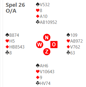 Afgelopen donderdag was er op spel 26 voor iedereen werk aan de winkel: Bij ons aan tafel was het biedverloop: West Noord Oost Zuid – – pas 1♥ pas 1♠ pas 2♣ 2♦ 2SA(?) 3♦ pas pas 4♣ (allen passen) Onze tegenstanders waren gestrand in 4♣ terwijl het slem voor hun is. Daar hielden zij toch nog bijna 10% aan over. Er vielen mij een aantal dingen op. Zoals dat het tegenwoordig ‘verplicht’ is om te bieden als je een uitkomst wilt aangeven. Vandaar dat Hanneke in tweede instantie met 2♦ volgde. Partners moeten er dus rekening mee houden dat een volgbod soms slechts een behulpzaam bod voor de uitkomst kan zijn en dan niet heel veel beloofd. Op dit spel was dat wel duidelijk gezien het bieden van de tegenpartij en haar eerste pas. Op de frequentiestaat stond ook een aantal keer 5♣ en 6♣. Ongetwijfeld hebben er paren in dubio gezeten: als 3Sa (+1) er in zit, houden we niet veel over aan 5♣ en moeten we maar naar 6♣ doorbieden om beter te scoren. Vijf klaver plus één was 40% en drie SA plus één was 60%. Zes klaver werd geboden door John&Gijs en Piet&Hans en dat was natuurlijk een gedeelde zaaltop voor hun. Het is dit weekend het eerste weekend van de landelijke parencompetities. Klik hier om te zien hoe onze clubgenoten het doen.
