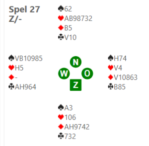 Voor degenen die in 4♠ zaten was het spel niet zo spannend. De drie paren die in 5♠x zaten gingen alle drie down! Hanneke ging ook één down in 5♠x na het volgende biedverloop: