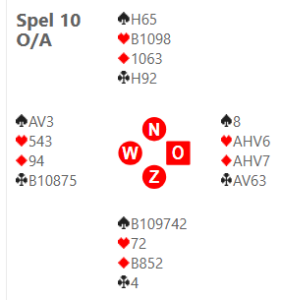Ik vind dat west moet passen op een heropeningsdoublet van oost op 4, omdat je een hele zwakke vlakke hand hebt. Vier harten moet maar down, je gelooft niet dat 4♠ er in zit. Maar ja, op dit spel is ongedubbeld een paar down gaan in 4♠ toch wel veel beter dan 4X contract tegen krijgen….