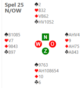 Ik opende de oosthand met 2♣ en bood, na 2 bij Hanneke, 2SA (23-24). In 3 SA kwam ik (en anderen) met de schrik vrij omdat, na ♠B start voor ♠A, klaverheer goed zat.