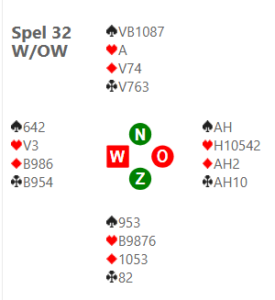 Kan dat nog hartens zijn? Nee want we weten 3 of 5 schoppens, 2+ruitens en 4klaveren wat al 9 kaarten zijn. Ergo de 2klaveren openaar heeft een 5??4 verdeling. Zou het VBxxx AB xx Vxxx kunnen zijn? Wellicht maar dat is wel een erg matige hand voor een opening. Waarschijnlijk is VBxxx A Vxx Vxxx. Daar speelde Aarnout op en hij speelde harten naar de 3! Dat lukte want secce aas en +600, na een geslaagde klaveren snit met ♥V als entree!